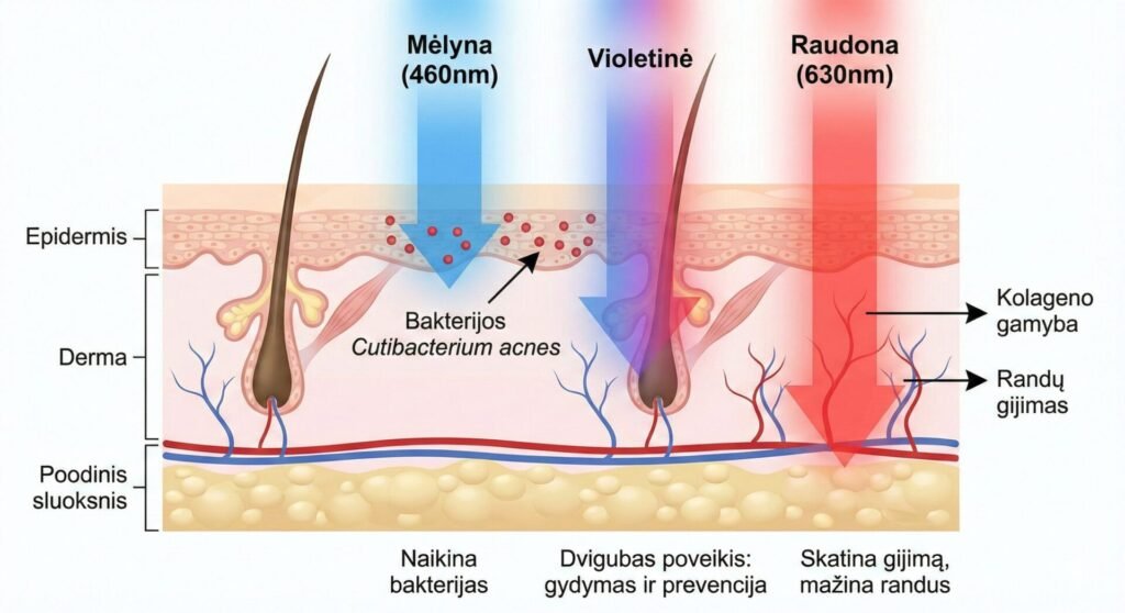 Dauguma pigių prietaisų siūlo tik mėlyną šviesą. Tačiau aknė yra kompleksinė problema – tai ne tik bakterijos, bet ir uždegimas bei randai. Mūsų LuminoMax Spectrum kaukė sprendžia visas tris problemas vienu metu: