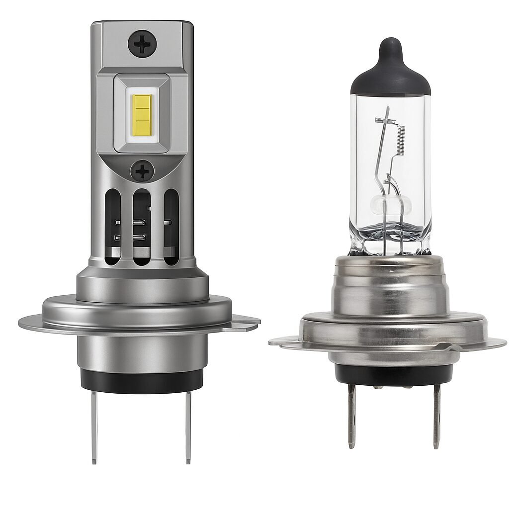 NextLevel H7 LED lemputės su inovatyviu 1:1 šviesos spindulio dizainu užtikrina tikslų originalių halogeninių lempučių šviesos išsklaidymą, tačiau yra ryškesnės, aiškesnės ir efektyvesnės. Nuotraukoje matomas tiesioginis palyginimas tarp standartinių halogeninių ir NextLevel LED H7 lempučių akivaizdžiai atskleidžia LED technologijos pranašumus – aiškesnę ir tolygiau paskirstytą šviesą. Šis LED atnaujinimas yra technologinis proveržis, padidinantis vairavimo saugumą, sumažinantis akių nuovargį ir užtikrinantis maksimalų komfortą nakties meturtą vairuojant. Mėgaukitės modernia technologija, kuri ne tik pagerina matomumą, bet ir mažina akių įtampą tamsiu paros metu.